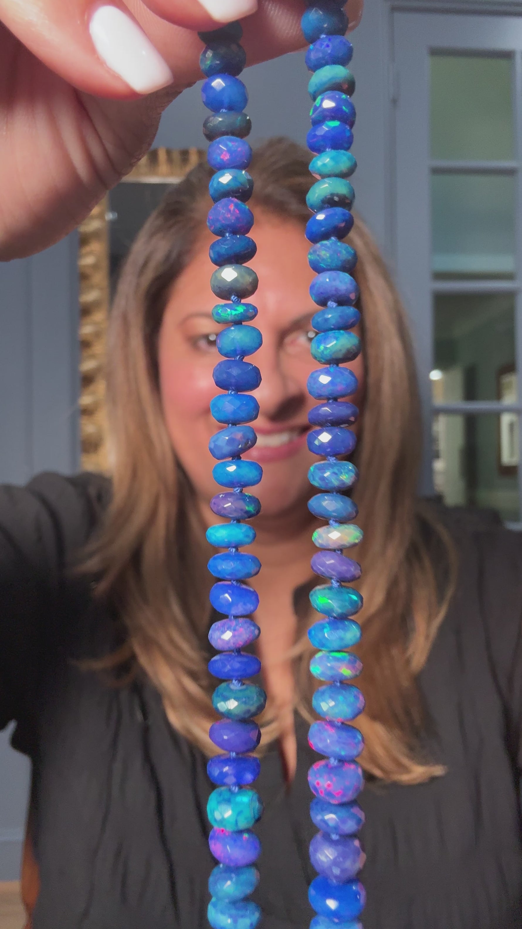 This opal-on-opal moment celebrates the full spectrum of the stone’s natural beauty — from the saturated blues and greens in the strand to the fiery violet flashes of the pendant. The ornate diamond setting adds polish without distraction.