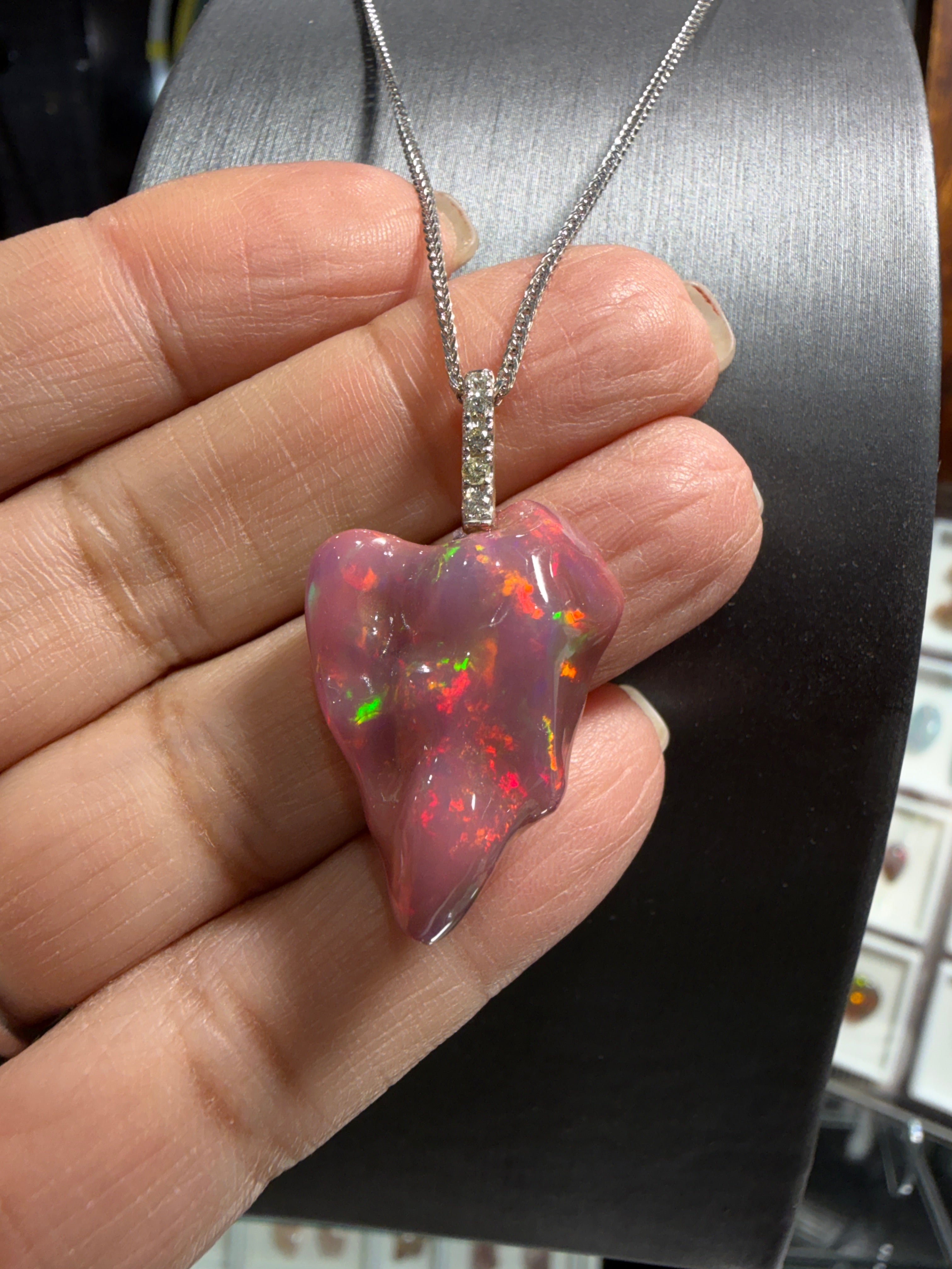 I work primarily in sterling silver (.925) and 14k and 18k gold (yellow and white) with natural precious and semi-precious gemstones including sapphires, emeralds, rubies, tourmalines, opals, aquamarines, garnets, spinels, tanzanites, and natural diamonds. When I use pearls, I select high-quality natural freshwater and Tahitian pearls. All pieces use genuine, untreated or disclosed-treatment gemstones sourced directly from gem shows. Each product page lists exact materials, gemstone origins, and metal finish.