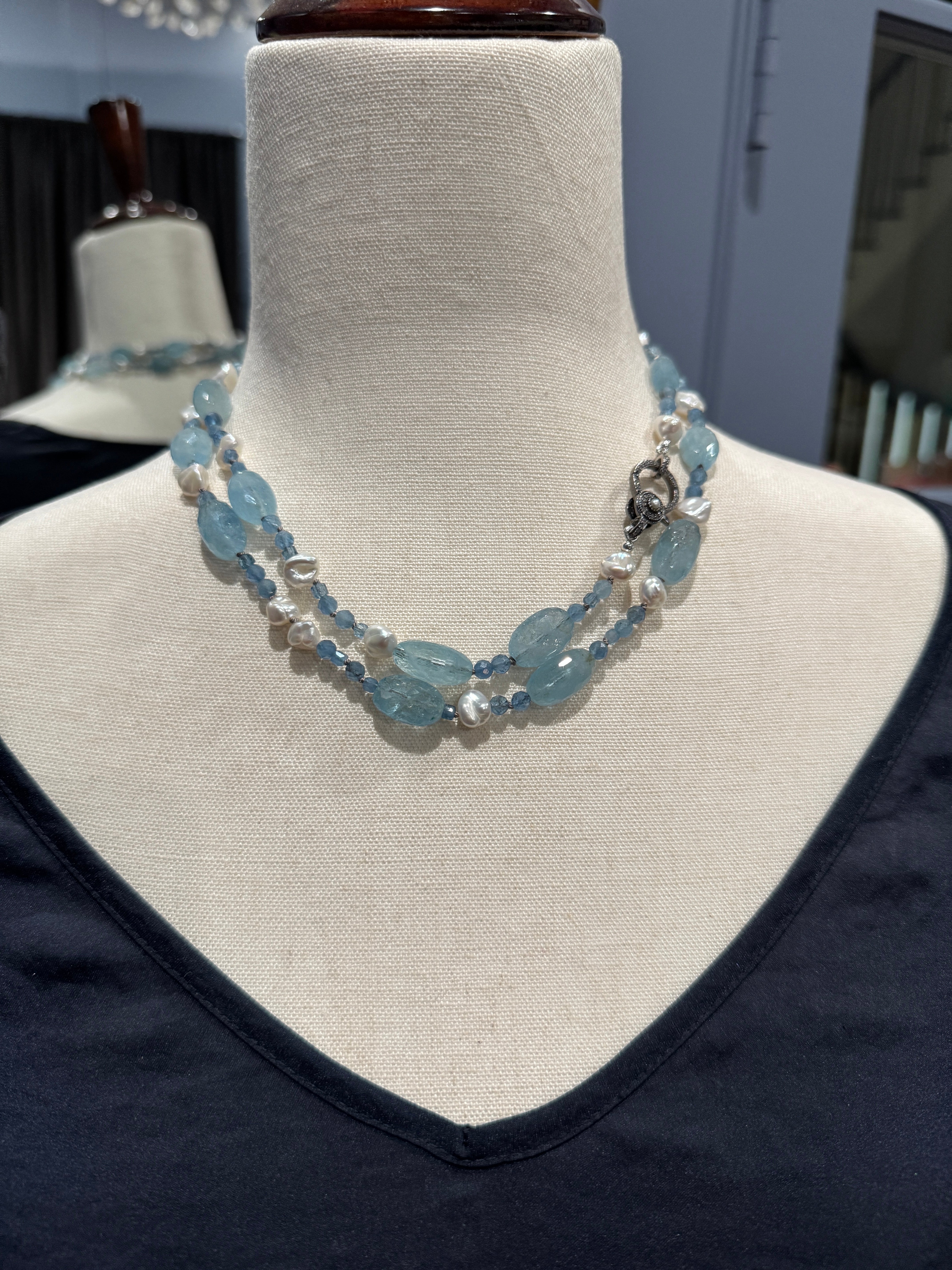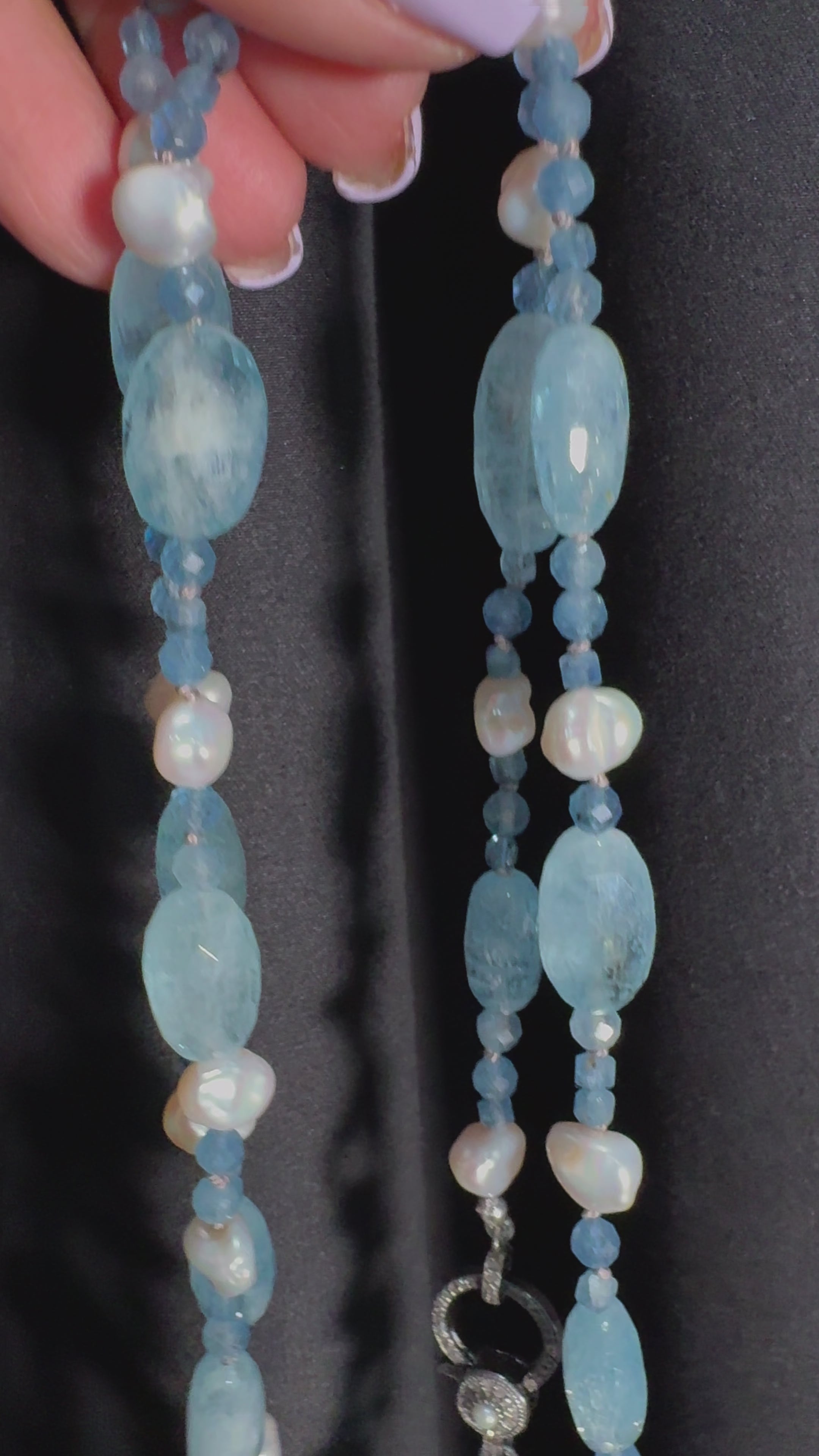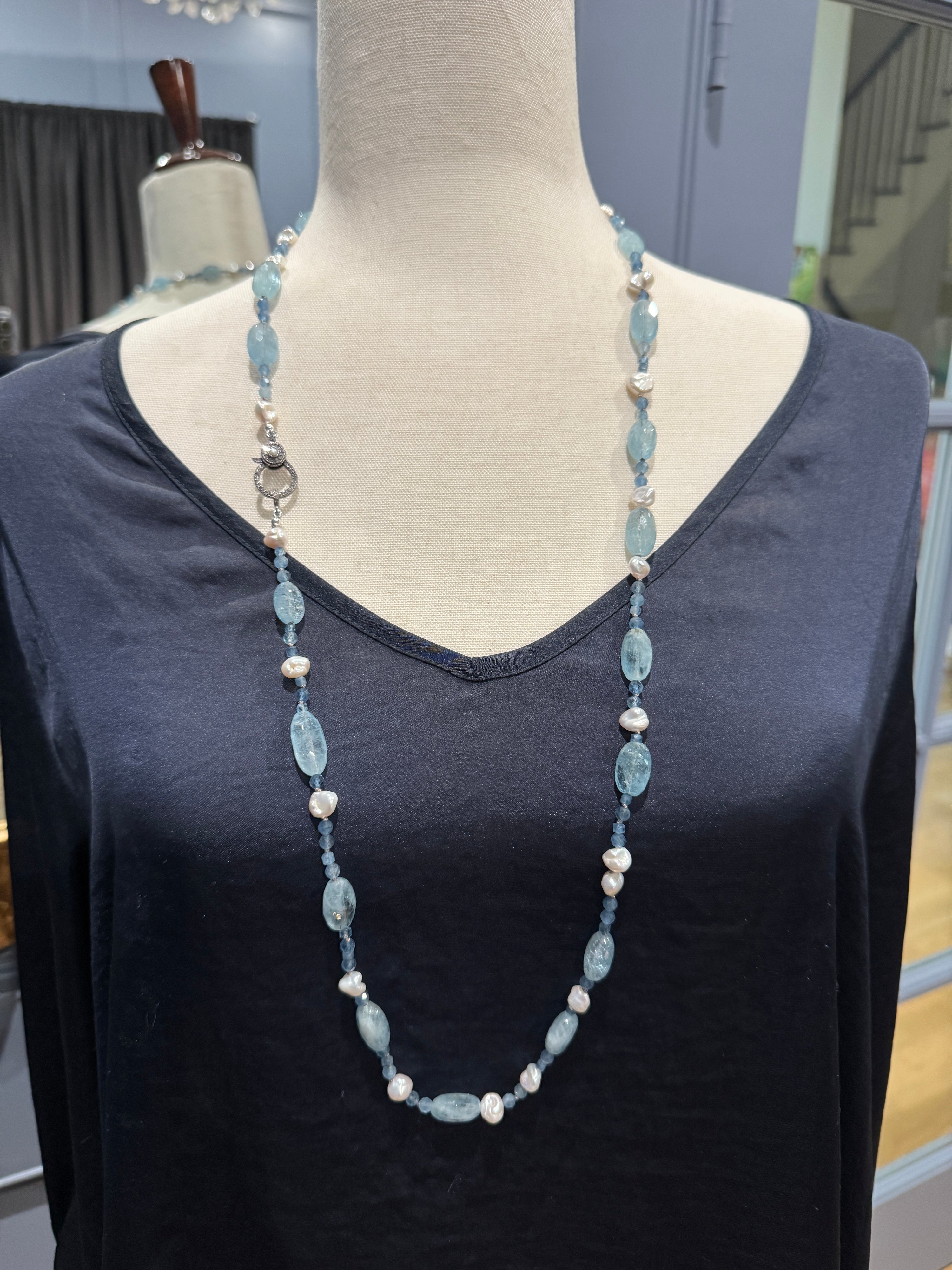 36” Santa Maria Aquamarine & White Keshi Pearl Necklace | Rare Blue Beauty | Soft Radiance | Feel Serene