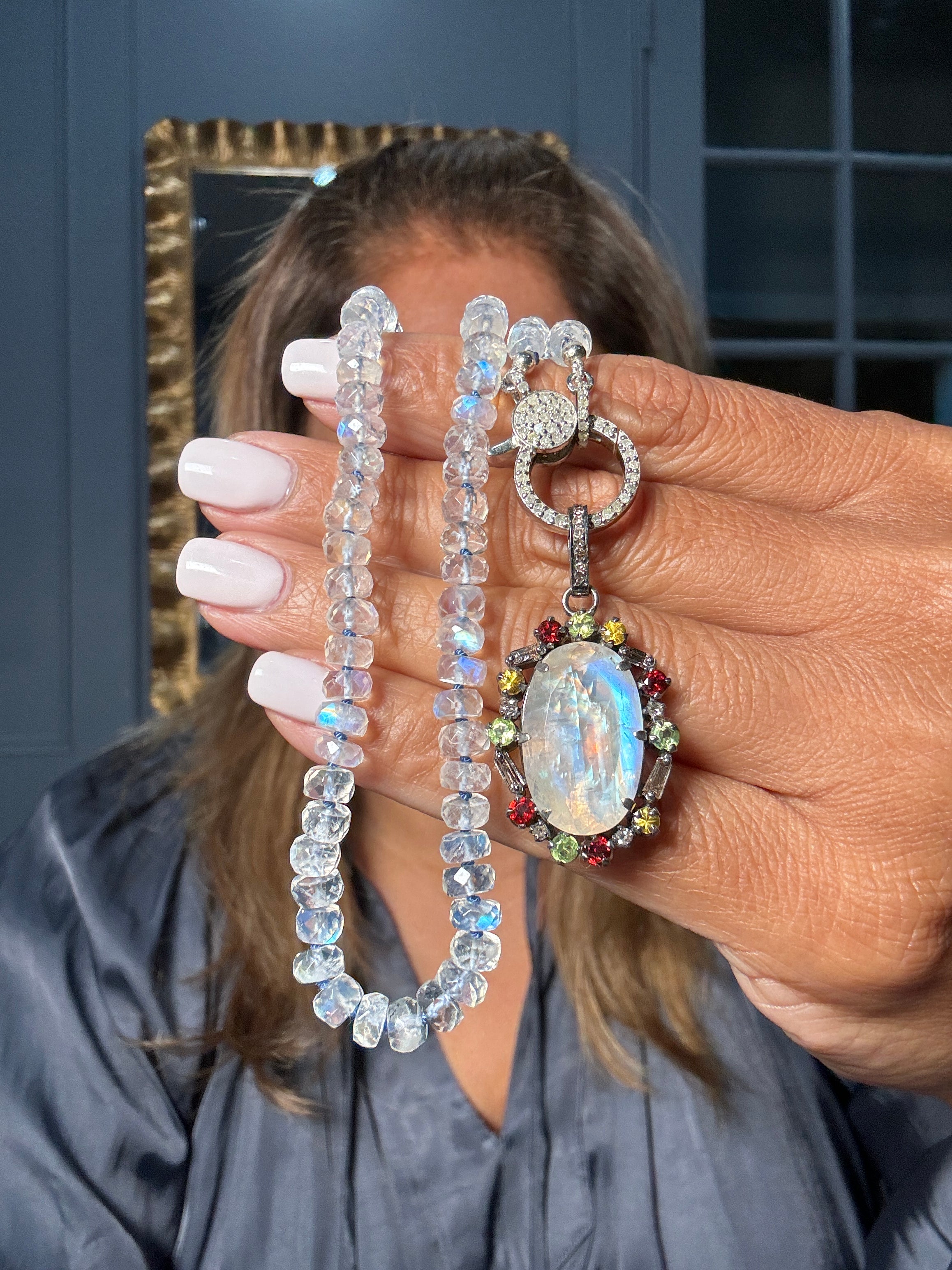 18” faceted moonstone necklace with icy rainbow flash, paired with an oval moonstone pendant framed in multicolor sapphires and pavé diamonds. A radiant Ulka Rocks original in oxidized silver.